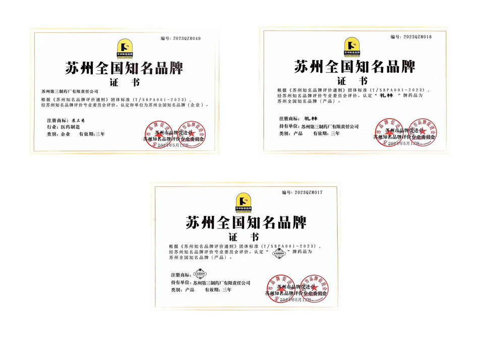 2024年“苏三药”注册商标荣获“苏州全国知名品牌(企业)”;苏州第三制药厂有限公司旗下的“康尔”、“礼林”被评为苏州全国知名品牌(产品)。